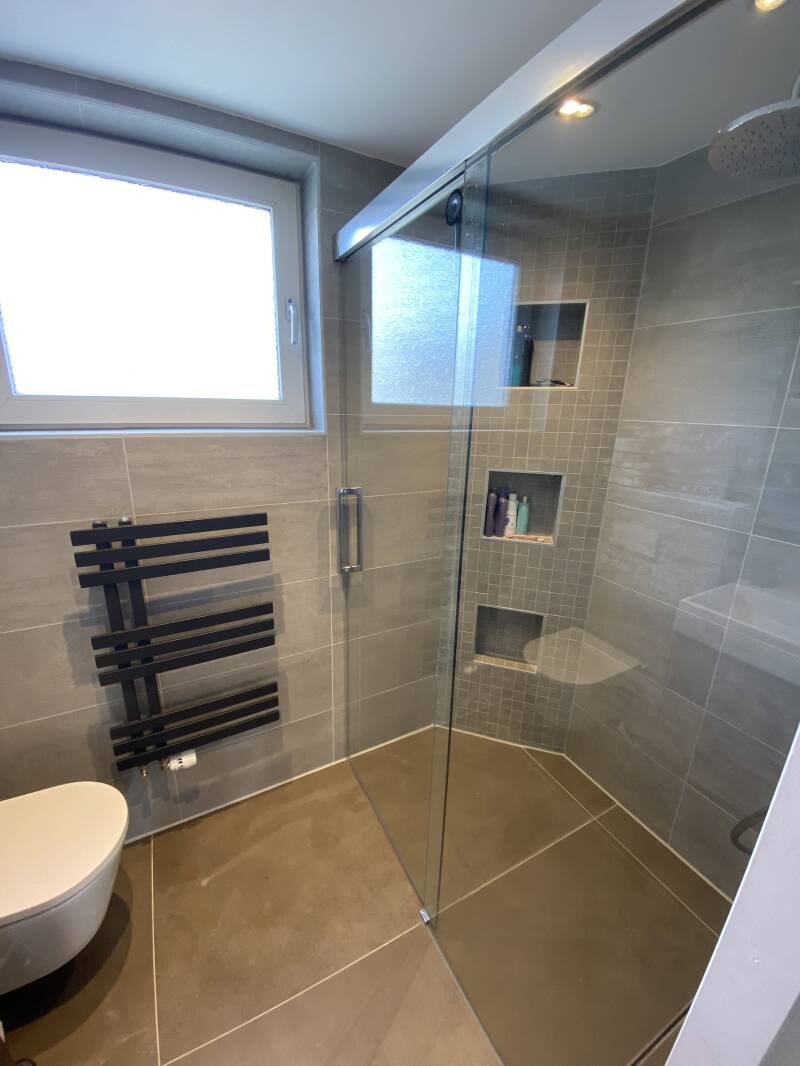 Mooie strakke uitstraling met kopere kleur kranen. 2 douchekoppen van hetzelfde materiaal en kleur. Vloerverwarming erin geplaatst. Nieuwe kunsstof kozijn geplaatst en een prachtige kopere kleur douchewand.