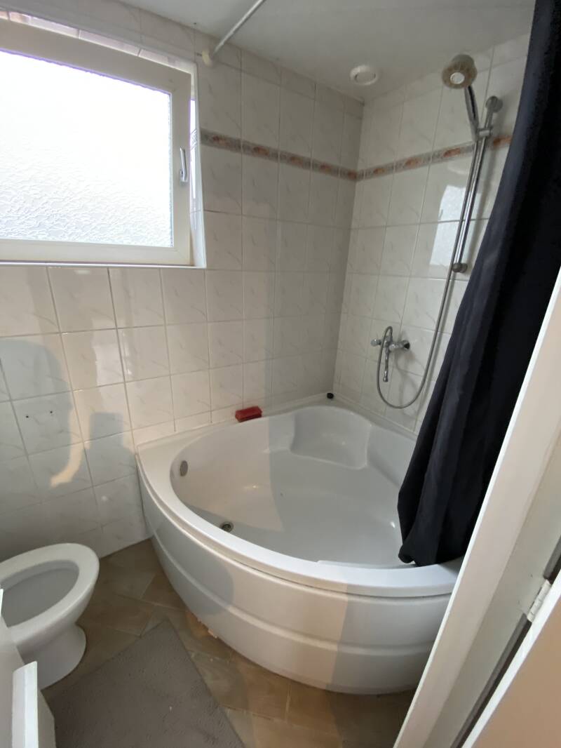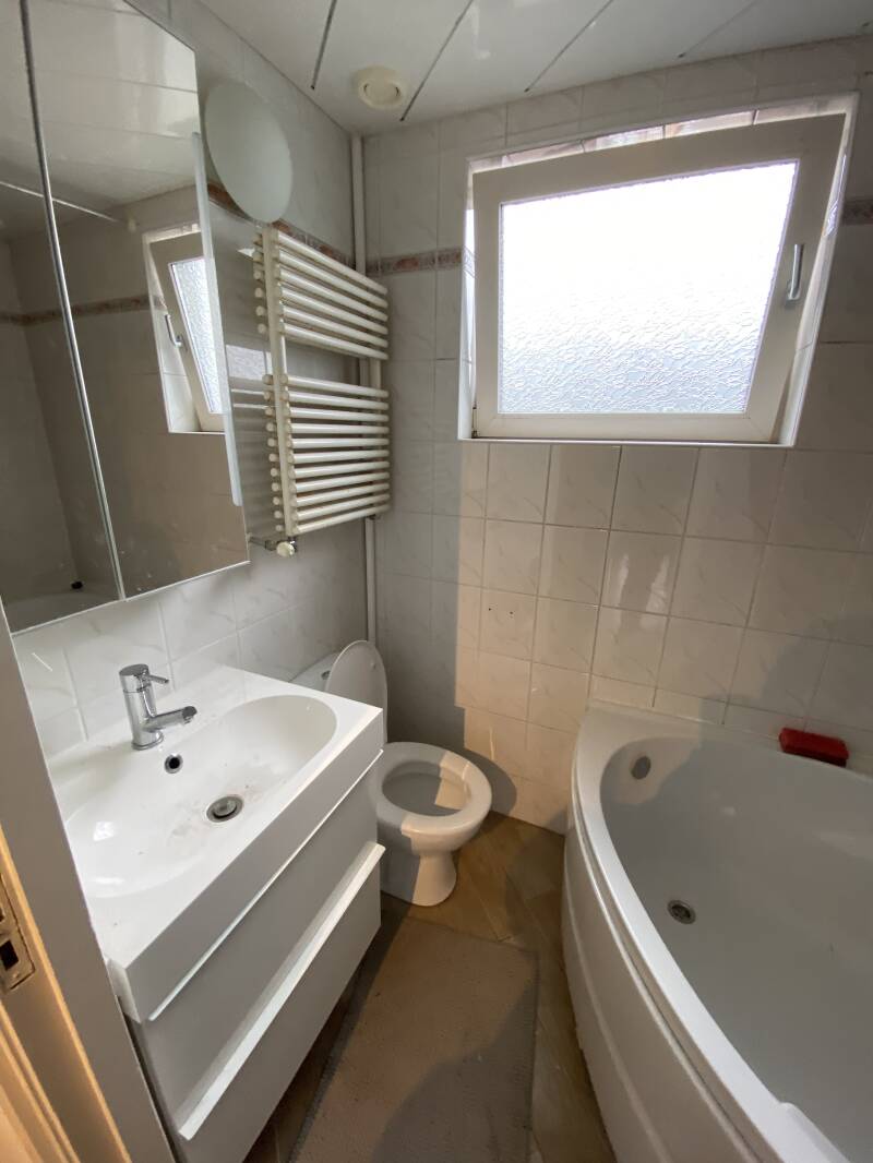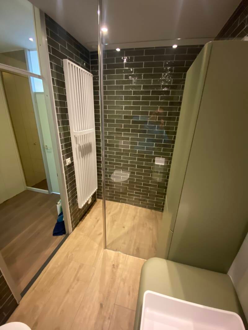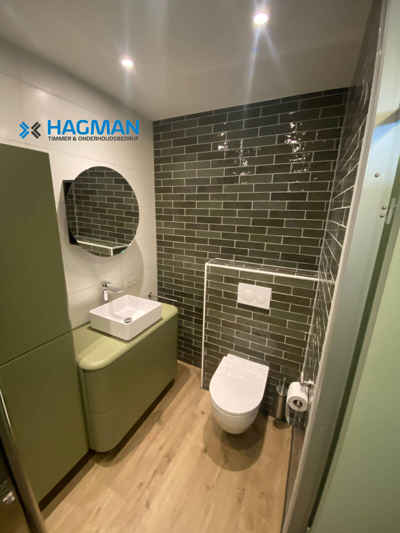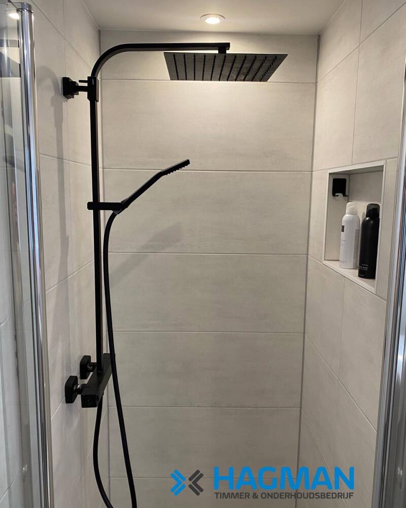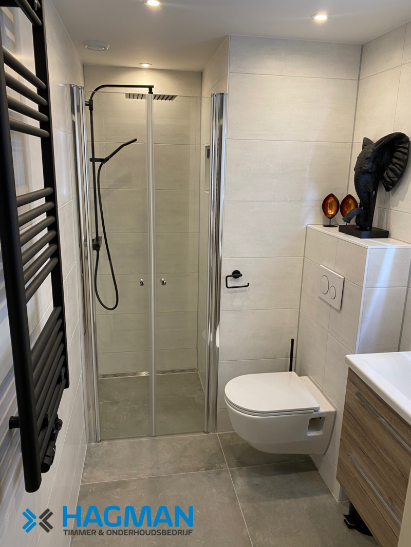 Hierbij hebben wij de indeling veranderd zodat de badkamer groter is geworden. Ook hebben wij het plafond verlaagd met inbouw spots, dat geeft een mooie strakke uitstraling.